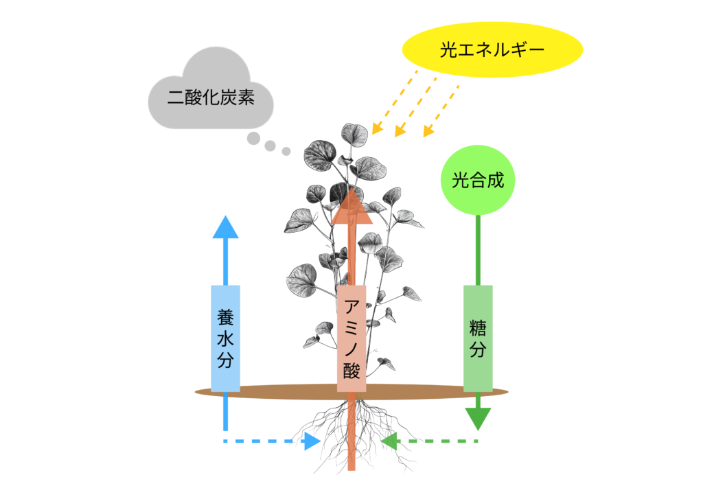 図のように、光合成は単なるエネルギー生産ではなく、根からの養水分輸送や炭素固定と密接に連動し、植物全体の成長を支える土台となっています。