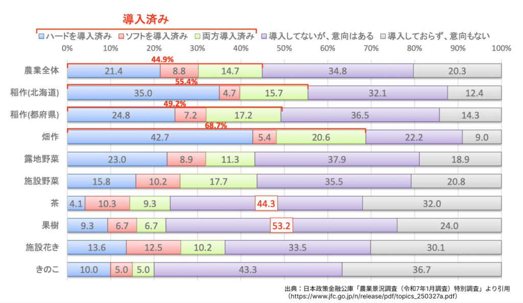 日本政策金融公庫が2025年3月に発表した「農業景況調査(令和7年1月)」によると、スマート農業の”導入率”は全体で44.9%と、およそ2戸に1戸が何らかの形で技術を取り入れている状況です。