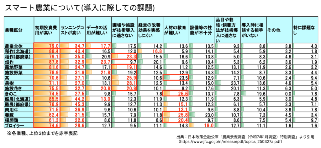 導入していない農家の約5割がコスト面の不安を理由として挙げており、小規模農家にとっては大きな壁となっています。